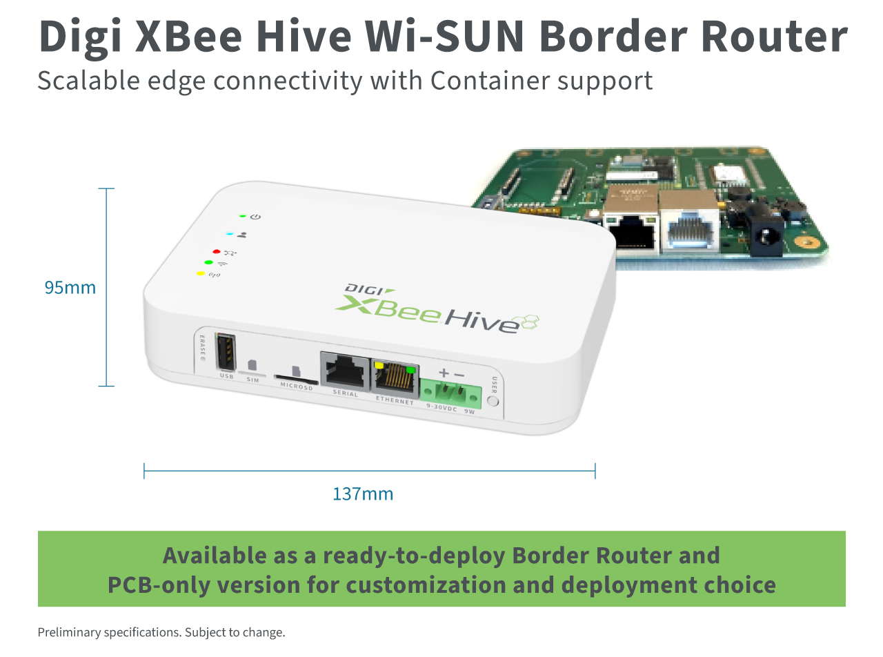 El router Digi XBee Hive Border sirve de pasarela entre su red mallada Wi-SUN y su infraestructura existente. Estos dispositivos de diseño específico pueden utilizarse en proyectos piloto o en despliegues empresariales y admiten cientos de nodos Wi-SUN por router.