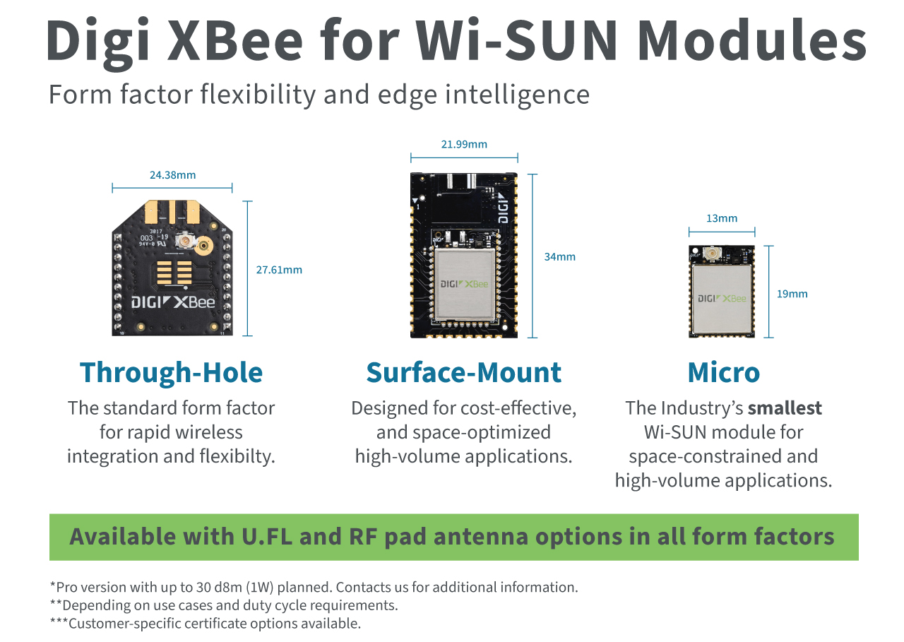 Los módulos Digi XBee for Wi-SUN, disponibles en tres formatos estándar del sector (taladro pasante, montaje en superficie y micromontaje) que han permitido el despliegue de más de 25 millones de módulos en todo el mundo, ofrecen la máxima flexibilidad de diseño. Los módulos se presentan en dos variantes: Los módulos Leaf Node (LFN) consiguen una duración de la batería de hasta 10 años para sensores remotos con conectividad Bluetooth LE opcional, mientras que los módulos Full Function Node (FFN) son dispositivos alimentados que admiten aplicaciones de alto rendimiento con velocidades de datos de hasta 2,4 Mbps.