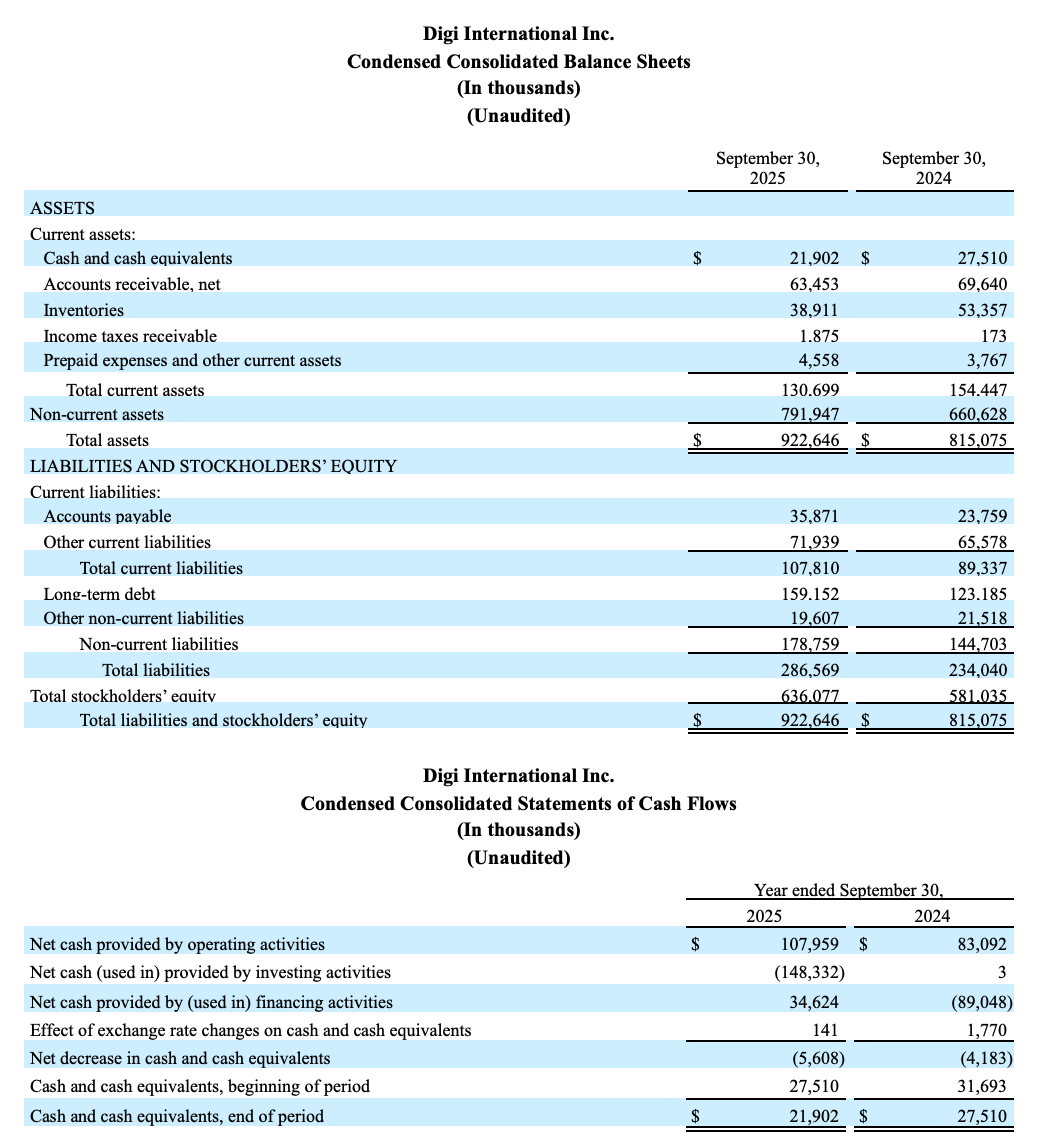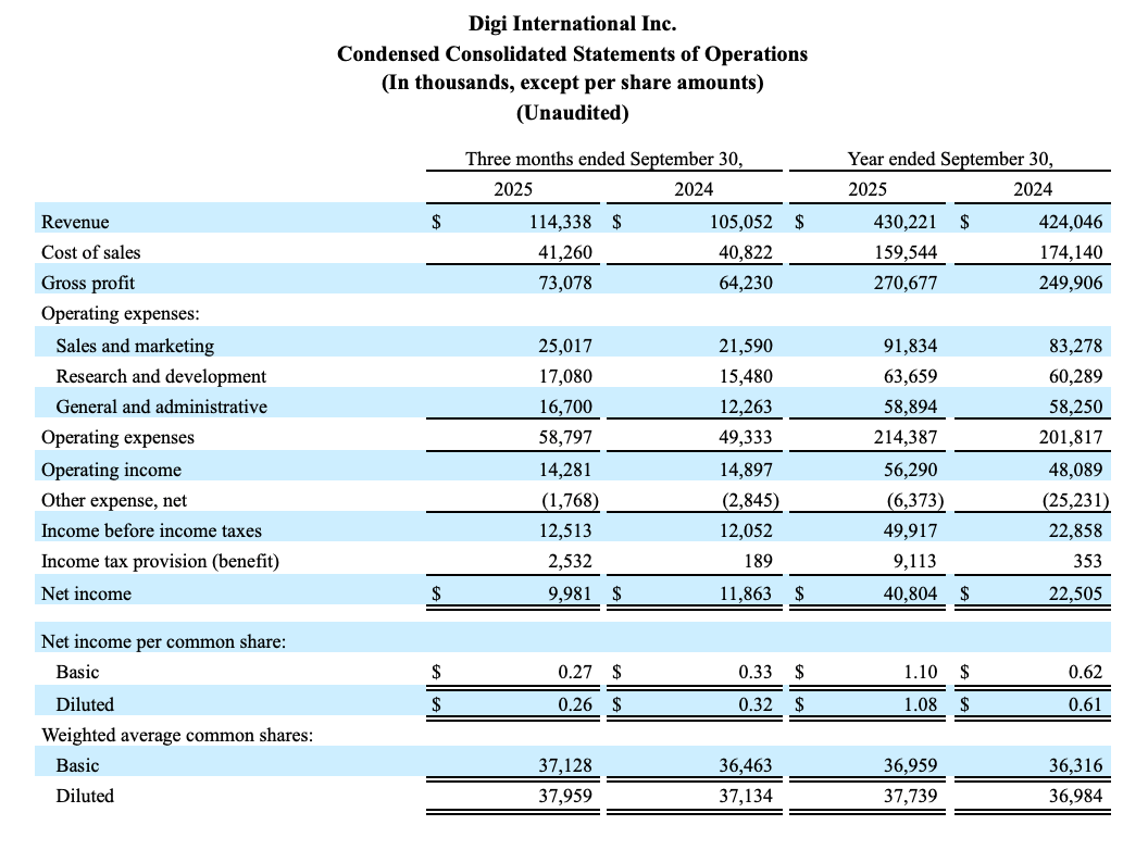 (Minneapolis, MN, 12 de noviembre de 2025) - Digi International Inc. ("Digi" o la "Empresa") (Nasdaq: DGII), proveedor líder mundial de productos, servicios y soluciones empresariales y de misión crítica del Internet de las Cosas (IoT"), ha anunciado hoy sus resultados financieros correspondientes a su cuarto trimestre fiscal, finalizado el 30 de septiembre de 2025.